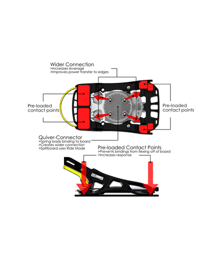 • Quiver Connector система: Улеснява лесното и бързо преминаване между различни сноуборд дъски, без нужда от инструменти.